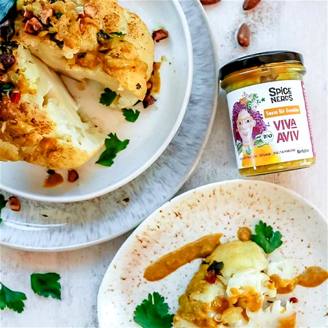 Blumenkohl für ca. 30-40 Minuten backen und anschließend mit veganer Blumenkohl-Sauce Viva Aviv servieren.